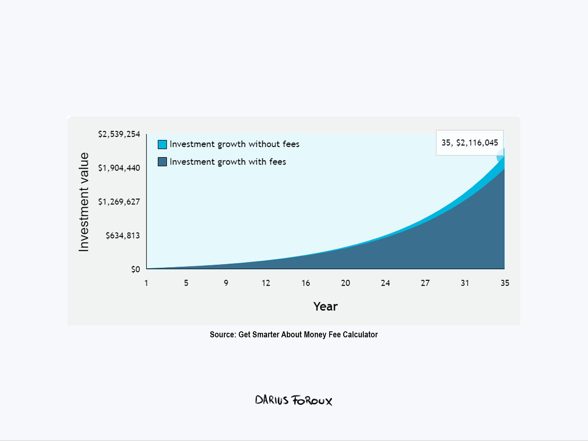 The S&P 500 index has an average annual return of 10.7% in the past 30 years.3Source: Motley Fool That means your $500 monthly investment would likely turn into $2,116,045 by the end of year 35. With compounding, your total fees would amount to $239,588.4Source: Get Smart About Money Fee Calculator And instead of $2.1 million, you’ll only go home with a little over $1.8 million.